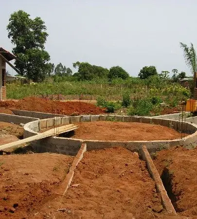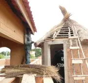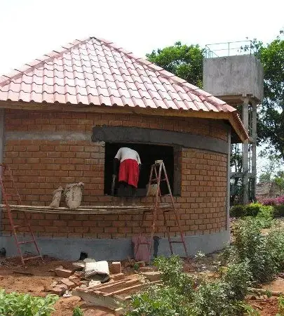 Avec des briques stabilisées ces bungalows ont été construits à Kpahou, dans la commune de Tori à 2km du marché de Kpahou. Les murs des bungalows sont doublés sur deux montages de 40cm de largeur 15cm pour brique d’extérieur espacés de 10cm entre les bungalows - matériel - briquesdeux montages de murs et remplies avec de sable lagunaire pour tuer les vibrations extérieurs. Ça donne plus la fraîcheur. Les bungalows sont à 8m de diamètre. Un bungalow à 2 pièces une chambre 1 salon 1douche et une terrasse. La hauteur des portes est de 2m 15cm et la hauteur des bungalows est à 3m après la charpente. Les huiles de ces charpentes ont été fabriquées avec du ciment.
